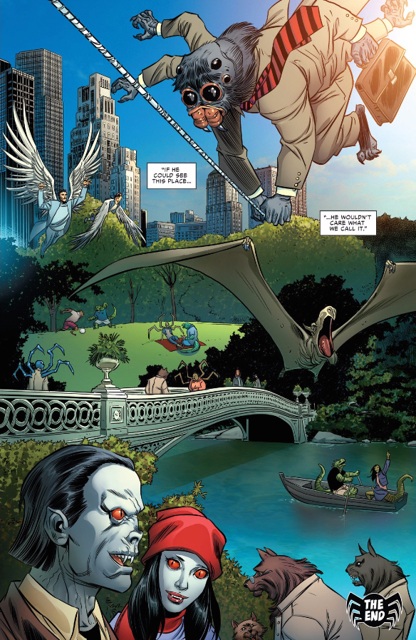Drew: It’s no coincidence that Patrick would paint Spider-Man as “an agent of joy, of youthful exuberance, of motion and excitement,” as this week’s Spider-Island is the sole respite from the otherwise oppressively serious tone of Secret Wars. Sure, this issue has its share of sacrifice and hero-lauding, but it’s also the only one that features a guy in a spider costume asking Dino-Thor if he’s related to Stegron. That’s not to say that this issue doesn’t take itself seriously — Flash’s death is given just the right amount of space to really hit home — just that it’s also aware of how silly “Spider-Island” is as a concept. That self-awareness is absolutely necessary to make the mourning of vampires, werewolves, and lizard-people not feel like a total joke. It’s a tricky balance of serious and silly, and no single image captures that better than the closing splash page.