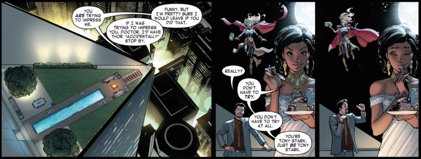 Cheap laughs! I loved Thor wooshing in to be impressive and then Tony shooing her way. I thought that was a well-earned joke, totally in character for both Tony and Bendis.
