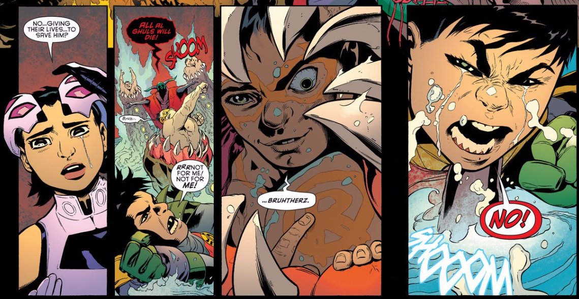 Is there any way to argue that these brothers didn’t care about each other? Absolutely not. And it’s not just the fact that the Sons of Batman love Damian that amazes Maya; it’s that they’ve got the guts to sacrifice themselves for love, and it’s that they found the strength to do so in the first place from their brother. Earlier in the issue we see the Sons of Batman smearing fruit juice on themselves in the shape of Robin’s mask and insignia; Damian is their inspiration. That’s a first for this Robin, and the enormity of it doesn’t escape NoBody.