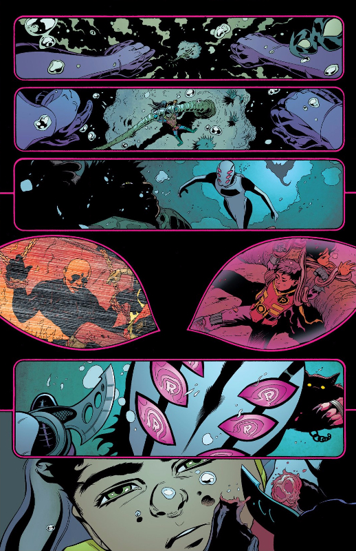 I love the composition of this page, especially the symmetry between Damian’s current predicament and the way he left the original NoBody to die. Gleason is clearly establishing an equivalent exchange here, showing that this is the closest Maya may ever get to genuine justice for her father. Moreover, Damian is already drowning; if Maya is still uncertain that she could actually go through with killing Damian, well, this is her out. All she has to do is nothing. She’ll never have a more opportune moment.
