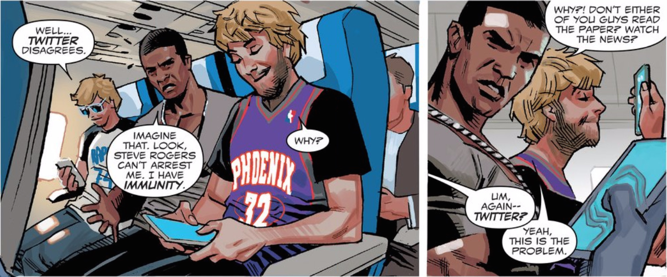 That’s not to say this series isn’t trading in controversial subjects — the immigration debate rears its head here — just that it’s not nearly as partisan as people accused it of being. Actually, the most brazen criticism seems to be of social media culture generally. Writer Nick Spencer doesn’t pull his punches on that subject at all — twitter is called by name, rather than any “chirper” or “tweeter” stand-in that we’re used to seeing in fiction. Of course, it’s hard for anyone to defend twitter from what Spencer is accusing it of here — all the evidence is in his own twitter feed from the last few weeks.
