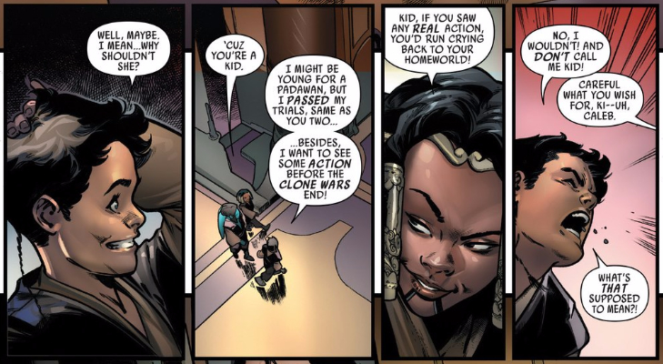Spencer: Absolutely, and sweet is the name of the game for this issue. Greg Weisman and Pepe Larraz portray Caleb as an actual child — sweet, curious, mischievous — and it’s thoroughly charming, as is the bond forming between him and Billaba.