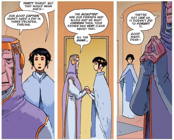 Yet, compared to the danger of the anti-sculpted zealots in the wildlands outside the Spire — who are capable of vaporizing an entire squadron of sculpted in an instant — the Spire is probably a godsend; in an earlier issue, another sculpted described choosing the city’s safety as the “lesser of two evils.” Does that mean that the Spire represents progress, that the Marchioness’ particular brand of bigotry is somehow “better” than the zealots’, that it’s a necessary step in achieving equality? One could probably make an argument supporting that point if they were so inclined, perhaps even pointing to Meera as an example of things getting better with each progressive generation, but there’s one powerful piece of evidence against it: the Baroness.