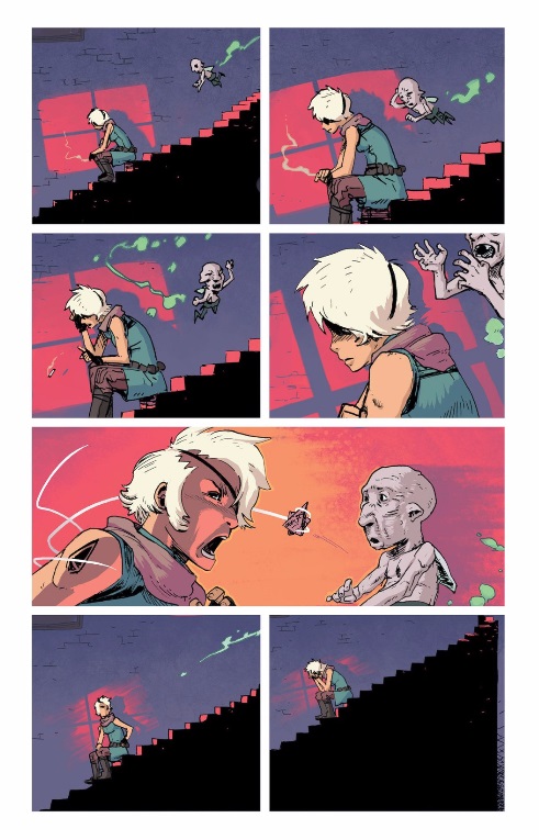 It’s actually a great scene for both characters. Previously, we’ve seen Shå thoughtlessly slap Pug in the back of the head for basically no reason, but that’s small potatoes to what she does here. She rips the cardboard deputy badge from Pug’s chest, which only reinforces the mockery he got for it in the previous issue. She’s totally betraying her downtrodden friend here, and aligning herself with the system that’s shitty to both of them. And this all happens wordlessly, using some inherently powerful imagery — sitting alone on the stairs — with some imagery that’s been cultivated within the series — the cardboard badge. Colorist André May gets in on the action too, subtly implying that the sun is setting outside, as the light pouring in through the window fades from orange to red and slowly disappears.