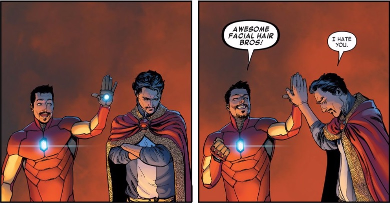With Invincible Iron Man, I think it is wrong to say that Tony wins even as he loses. Amara kisses Tony because of what he is like at that moment, because at that moment, he deserves it. Future issues are going to have to be careful with how they use Amara (the big thing is that Bendis needs to make sure that Amara is a fully realized character, and not let everything else distract from her so that she is just ‘love interest’), but the basic idea of Amara being interested in him when he is being open and honest and not an egocentric douchebag. But the facial hair bros joke was a big piece of indulgence that Bendis couldn’t resist, even if it doesn’t really fit.