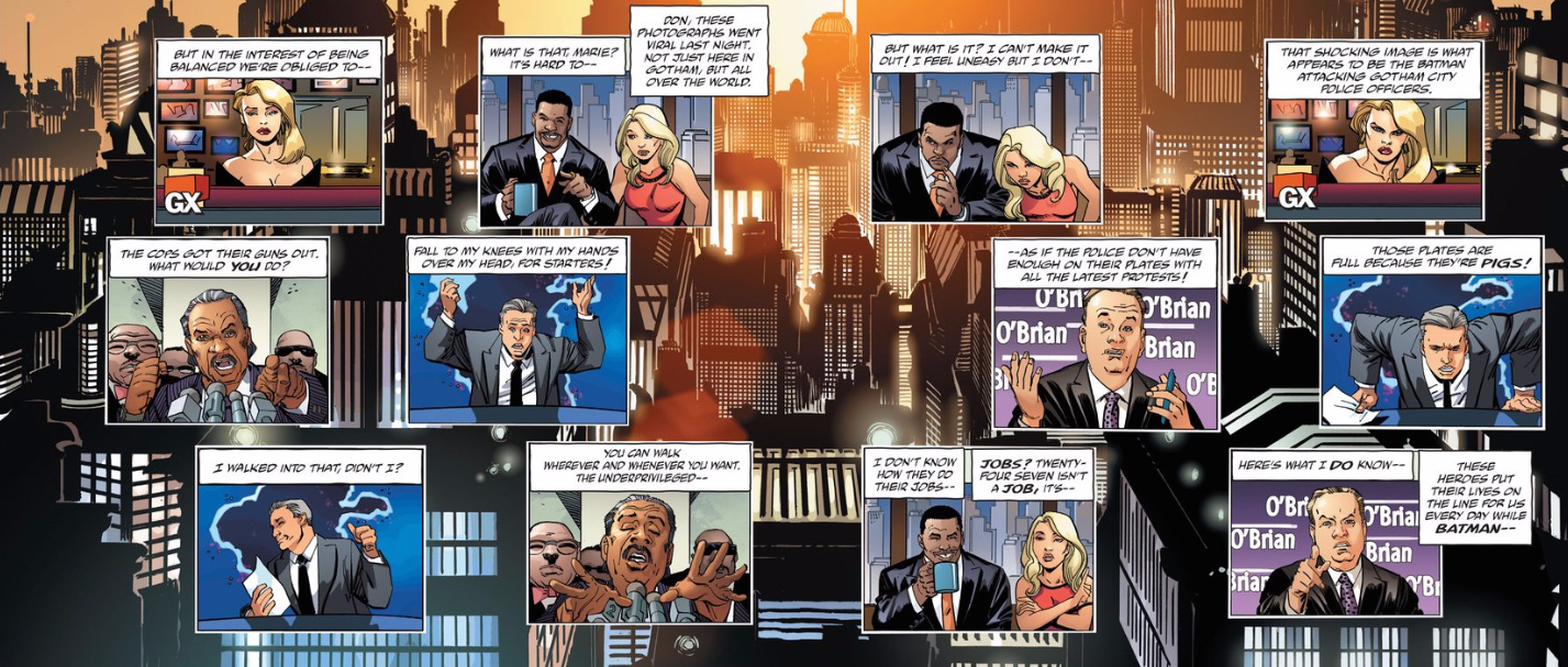 As with The Dark Knight Strikes Again, the personalities here so closely resemble actual pundits and tv hosts to be a bit distracting, but that may actually work in favor of the larger point, which suggests that Batman is so effective as an idea, it almost doesn’t matter if he actually exists. He’s used to further the agendas of all of these figures, without any regard for the context of his actions, or even who it is behind the cowl. They’re reacting to a legacy, using the present example only as a springboard to spout their opinions about that legacy.