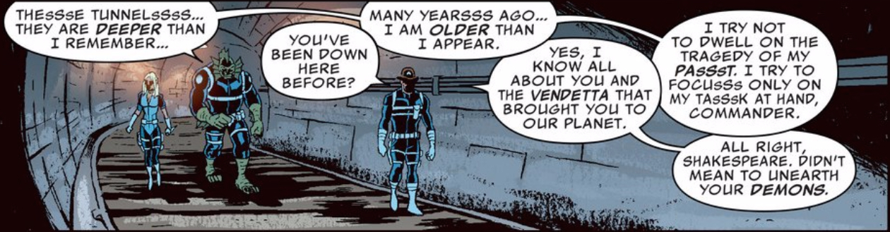 I’m not sure why Duggan would consider “focusing on the task at hand” a demon, or what any of that has to do with Shakespeare. It’s clearly meant to be a casual tease, but it doesn’t actually correspond to what Manphibian was saying. This series might be fun if it was able to achieve the Whedon-esque back-and-forth it seems to want to, but without that distinguishing charm (which again, would at best make this series derivative), there’s nothing to set this series apart from countless others on the shelves.