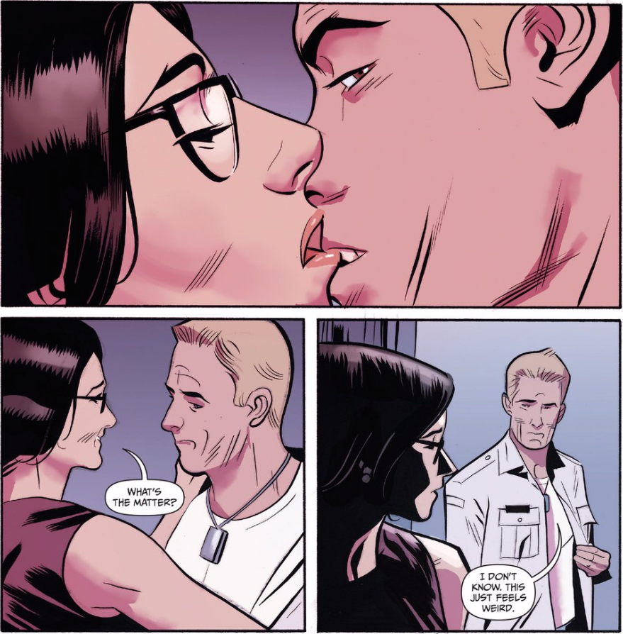 The issue opens on Sheldon and Jane, falling into traditional gender roles — and their just-as-traditional exaggeration in superhero comics: he’s powerful, she’s helpless, and they’re both okay with that. It’s so common that it wouldn’t be remarkable if Millar didn’t spend the rest of the issue contrasting it with Grace’s struggle to even find anyone willing to be with such a powerful woman. Curiously, she’s never explicit about exactly how much power she has, but an episode with a random sailor makes it clear that she can’t hide it.