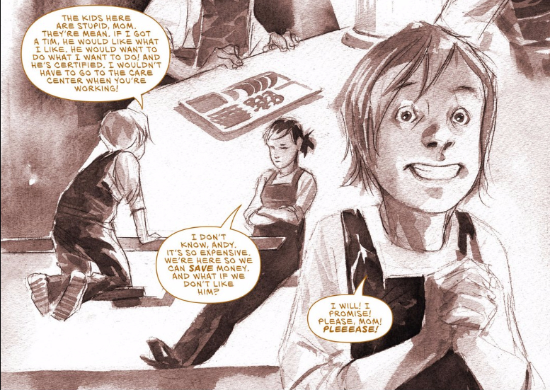 For example, I don’t know if this comes across in the digital versions, but in my physical copy, often times you’ll find a close-up of young Andy in a flashback and a close-up of modern-day Andy side by side on adjacent pages, making his transformation (both physical and emotional) more obvious than ever (There’s also a neat bit of imagery that only works in the physical version in that final image Ryan posted — the center of the book cuts right between Andy and his mother, splitting them apart just moments before the narrative itself does).