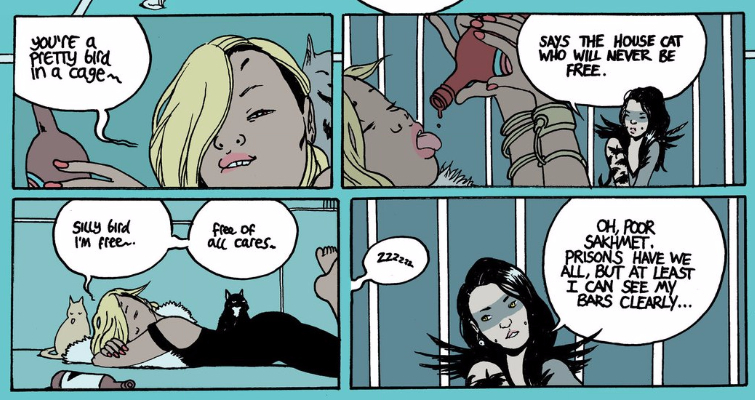 Befitting a cat goddess, Sakhmet lives entirely in the moment, paying as little attention to the past or future as possible. It’s not as much fun as it sounds, a sentiment best expressed by guest artist Brandon Graham’s muted pallet and straightforward staging — Graham even manages to make an orgy look dull, and for this story, that’s a plus. What’s most damning about Sakhmet’s hedonism, though, is that it’s largely self-enforced. Living “in the present” isn’t Sakhmet’s animal nature asserting itself — at least, it’s mostly not — it’s Sakhmet trying to stop herself from feeling anything. Maybe that frees her from the pain of her past, but it also dulls the pleasures of the present. For Sakhmet, even freedom is a cage.