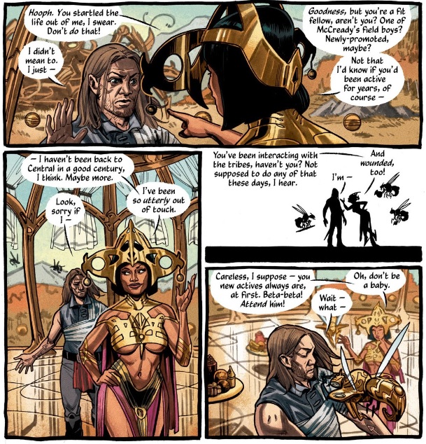 Spencer: Misunderstandings are at the heart of Kurt Busiek and Benjamin Dewey’s Autumnlands: Tooth & Claw 8 — or, perhaps more accurately, characters who refuse to, or are otherwise unable to understand others drive this issue’s conflicts. Take Leonid and Dusty’s confrontation with some angry goat people, who are looking to drive any intruders they assume to be wizards out of their lands — their hatred for wizards is so great that they don’t really even care whether Leonid and Dusty actually are wizards or not. Dusty’s reaction, despite being far more open and peaceful, also stems from a failure to understand the men he’s talking to — he’s following his father’s very practical advice, but also letting it blind him to the very obvious aggression of the men he faces. Leonid’s about the only character keeping a clear head and approaching each interaction with the proper amount of investigation and insight, but even he finds himself stymied when he stumbles across a strange woman in the wilderness.