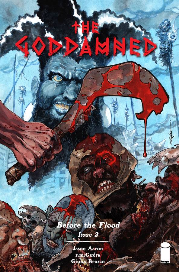 Ryan M.: The Goddamned posits a world where all good has been destroyed and all that left is degradation and pain. God has already chosen Noah’s family to be the sole survivors of the impending flood and I can’t blame Him. The unending cruelty of the world and Cain’s sincere desire to die in order to escape it makes for a very dark read. There is a narrative expectation that something will jar Cain from his ineffectual suicide attempts. Though Jason Aaron and R.M. Guera could’ve squeezed a few more issues out of an indestructible man fighting dinosaurs, I was hoping that the story was to be something beyond that. But what can disrupt Cain’s singular journey? In the last issue, a child asks for his protection and Cain refuses. In Goddamned 2, he gets another request for help, this time from a mother in search of her stolen son. Again, Cain refuses. At this point, I was ready to accept Cain and give up my hopes that he could use his curse of unending life to bring something good back into the wasteland. I should have remembered my Joseph Campbell and known that Cain was simply refusing the call. Cain’s change of heart is central to the issue and happens across a horrific splash page.