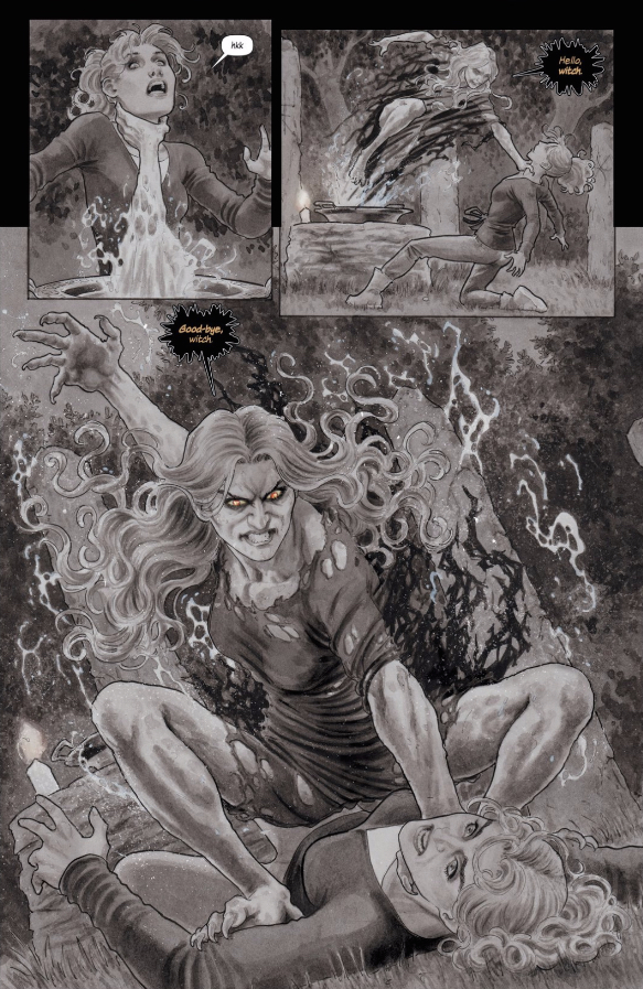The collusion between the ritual of smoking a cigarette with that of the spell preparation evokes a lovely contrast between the mundane and the magical, solidifying the fact that this witchcraft is — for these women — an insoluble part of their lives, as it should be seeing as Alex has been at this for centuries. The beautiful composition of the page comes across as meandering and relaxed by using overlapping panels and a view of Alex sauntering sans borders. All of this serves to make the final reveal Drew posted as all the more jarring. What IS that creature, which looks more like a wytch of Scott Snyder’s design than Black and Alex do? The best guess is that the feral thing is an agent of the larger conspiracy which has, since issue one, been catalyzing magical phenomenon against our good-guy magic users.