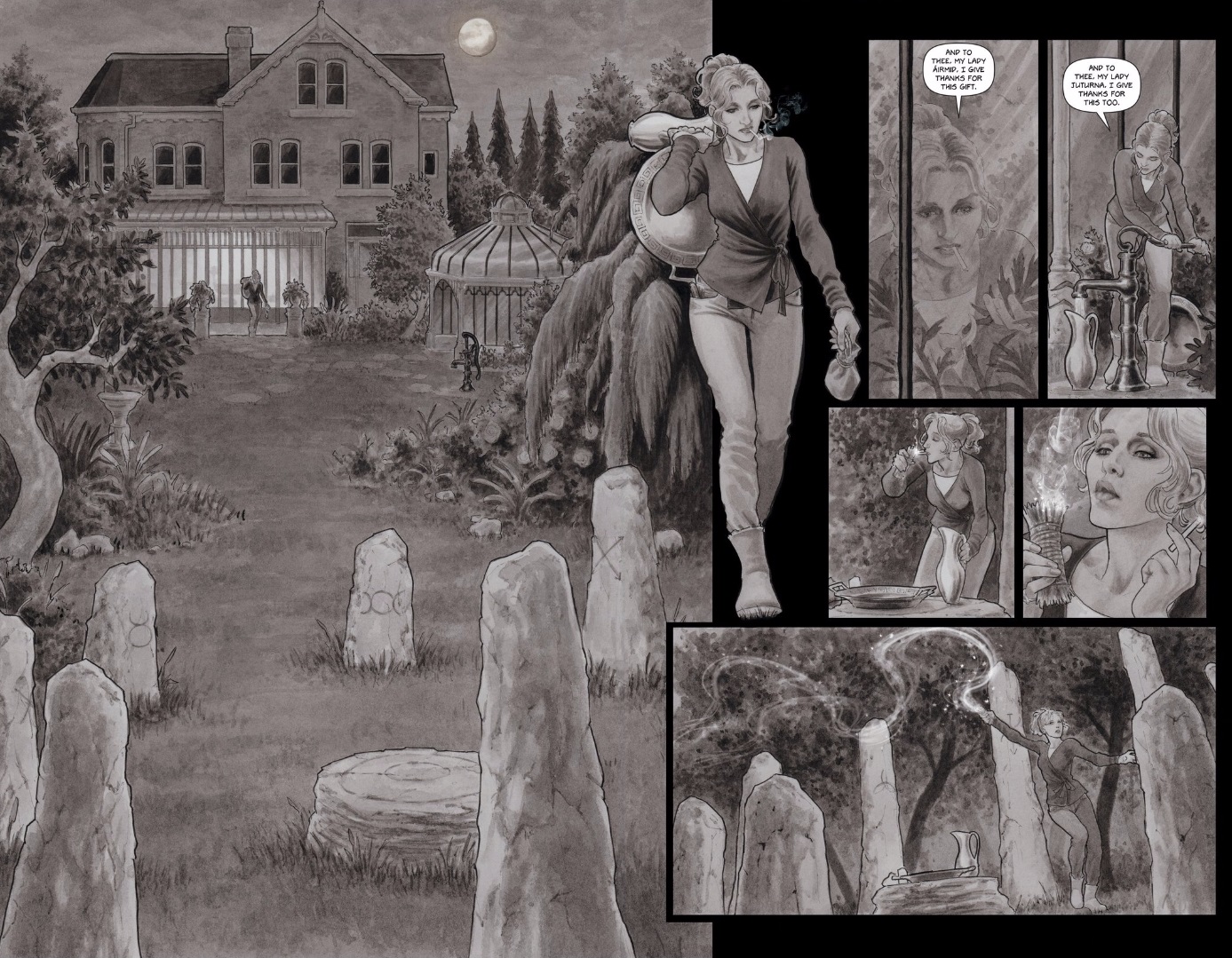 I have been delighted by Rucka and Scott’s patience and care they put into all of the scenes featuring the spells in the witches’ repertoires. Take, for example, this gorgeous two-page spread of Alex preparing for her divining rites: