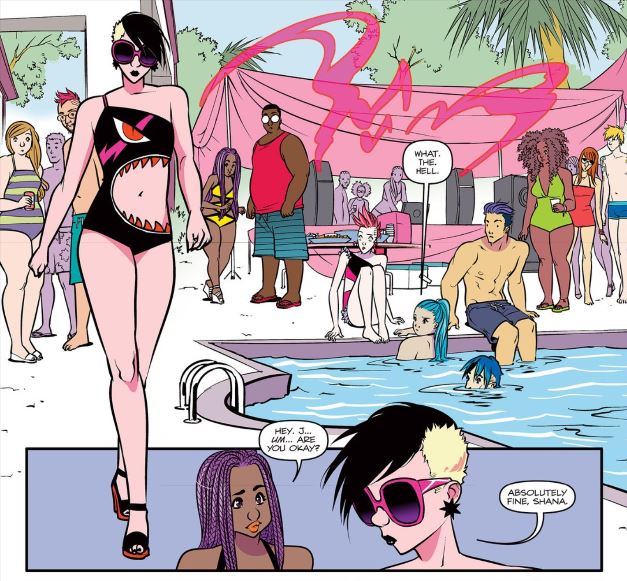 Under the Synergy’s dark influence, Jerrica has goth-punk hair, hangover sunglasses, and a swimsuit that looks like it wants to eat her. Sophie Campbell’s art imbues her with so much coolness in that first panel that everyone else around the pool is immediately a dweeb. They all stare at her walking by. Even the music in the air, shown with a jagged pink cloud, is angled to frame Dark Jerrica’s strut. It’s an exciting turn for the series and I am looking forward to seeing how the “Darkness” affects each of the sisters as well as how the Dark Holograms deal with the Misfits, especially since they are currently struggling without Pizzazz.