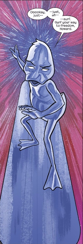 All of this new power comes with the unfortunate side-effect of being sought-after by some pretty heavy hitters on a cosmic scale, and Howard barely escapes from the likes of The Stranger and Galactus time and time again, albeit with help from the Silver Surfer, female clones, and the new Ben Grimm/Kitty Pryde version of the Guardians of the Galaxy. As you can see, there are a lot of set pieces to this tale, despite it being only four issues into its current season. Whether the bevy of cameos enriches, distracts from, or drives the comic, I cannot be too sure.