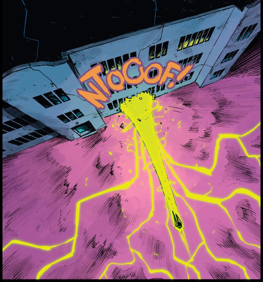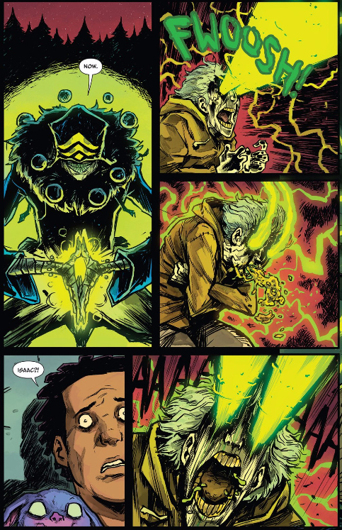 This, too, is unlike anything this creative team’s done on The Woods before. The use of shadow, its contrast with the green, the way Dialynas shows the pain this transformation is putting Isaac through, it’s all absolutely jaw-dropping. The issue next transitions from horror to straight-up action, giving us an Isaac who sparks electricity as he floats over the gym, swats aside arrows effortlessly, and blows Ben through a wall in yet another scene-stealing show of force.