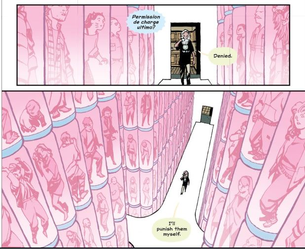The issue does contain some explicit answers to questions raised in the series run. Most significantly, we see that Grand Father has stored all of the missing citizens of Stony Stream in large jars in a room off his kitchen. Chiang maintains a depth to these figures. Each one tells a bit of a story, including Tony and Gabrielle, unchanged from the moment they were taken from the football field. This new information fits perfectly in with what we’ve seen from thus far, but Vaughan keeps the moment brief and full of impact before returning to the girls that we care about.