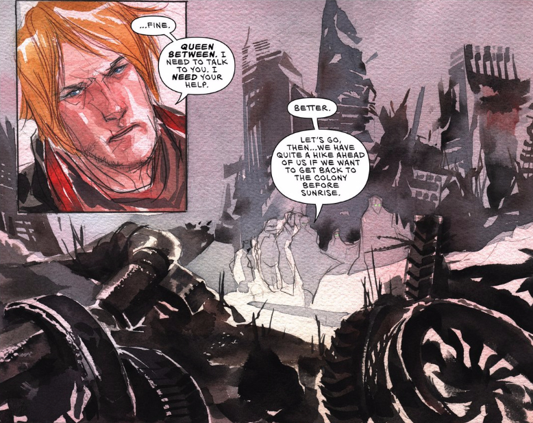 We would say “speak up,” of course, but since the citizens of Silenos can’t speak, and instead communicate telepathically, they’re told to think up. Sure, it’s mainly a cute joke on Lemire’s behalf, yet this moment not only works to expand upon the Silenoses’ abilities, but to show how comfortable and familiar their neighbor species are with them. It’s subtle, yet extremely effective world-building.