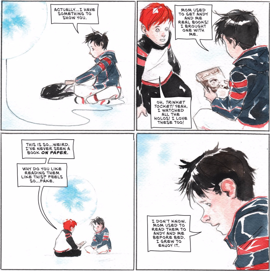 Both boys are excited at Trinket Tocket, though both also make a point of expressing their prior experience with it. Indeed, because Tim-22 has never seen a book on paper before, he finds this version illusory — a shadow of the experience he remembers. Tim-21, on the other hand, has fond memories of the print version, so prefers this one and, of course, the memories tied to it.