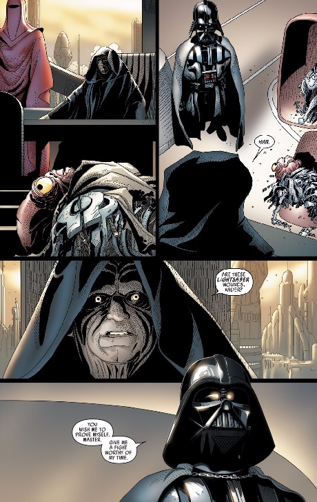 Compared to issues past, Darth Vader 16 was a bit of a disappointment for me — which isn’t to say that it is a bad comic. One of my tried and true personal favorites about Darth Vader are the tense, often wordless tête-à-tête scenes provided by Salvador Larroca. Having the book open with Vader tossing Karbin’s mangled cyber corpse at Palpatine’s feet was simply awesome. Larroca expertly stages the scene: the final panel of page 5 has Vader unabashedly admitting to killing Karbin himself, while Larroca frames Vader’s dominance over Palpatine by having Vader invade Palps’ panel space. Palpatine himself looks pretty nervous — you can see the lack of confidence in his beady yellow eyes.
