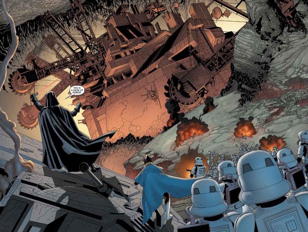 While the beginning of this issue certainly is its strong point, that doesn’t mean I didn’t like the rest of it by any means. Vader is once again at his most menacing and mean in this series. Take, for example, his scorched earth policy toward the Sho-turun rebels. The gigantic machines the Ore-Barons are using to rebel are the same they use to produce their precious metals. Vader gives absolutely no-fucks about this and destroys entire machine with hot lava. He does this despite knowing that these machines are centuries old and impossible to replace.