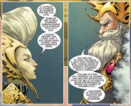 Odin’s actions have negatively impacted Freyja, transforming her from Asgardia’s All-Mother into a lowly prisoner, but that’s not her concern — she just wants what’s best for Asgard, and for Odin to discover what that is, he needs to be able to listen to his subjects and accept the fact that he needs to change. Odin, of course, can’t do that — he’s an unmovable object, absolutely convinced of his own omnipotency, in the idea that’s what best for everyone is to follow his every command, and that this will never change. I imagine that this scene makes each and every one of our readers picture a different institution, because there are so many with power in our world today who refuse to change, and continue to impose their own selfish will on those around them (be they be governments, big business, or even “men” as a general group). The first step in enacting change is listening, but most are unwilling to do so, because the idea ever being wrong about anything simply baffles them.