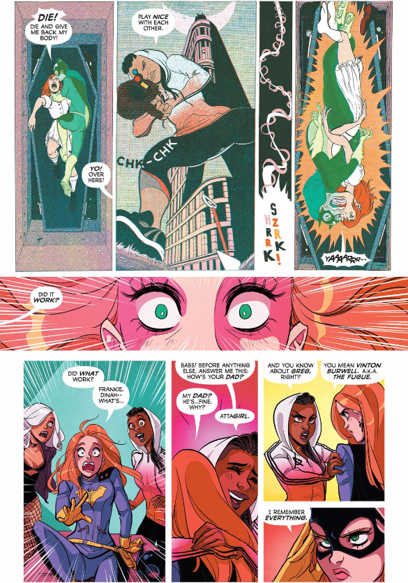 Barbara’s mind has been hacked and it’s up to Dinah and (mostly) Frankie to help free Batgirl’s mind from the clutches of her new foe The Fugue. Utilizing her neural implant, Frankie is able to dive into Babs’ mind — with the help of the evil A.I. Barbara — and weed out The Fugue and the memories that he’s tampered with. We discover that The Fugue is a bank robber that Batgirl put away years ago who has decided to take his revenge by attacking her photographic memory and selling her secrets to her enemies. Babs is only “woken up” after Frankie fuses real Babs with the evil A.I. Babs.