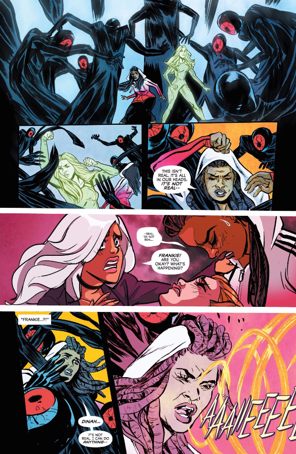 Ming Doyle is selling the holy living shit out of the horror in that scene, but I don’t think any one artist could make the jump from panels three to four there not jarring — Frankie appears in both, and while the unconscious Babs and presence of Dinah tells us that the fourth panel is in the “real world,” we might have to pause to understand that. Fortunately, we don’t have “any one artist,” but two, and the stylistic differences — already associated with the layers of reality by this point in the issue — cue us in immediately to what’s going on here. It makes the page much more legible, and subtly reinforces the otherworldly nature of the battle Frankie is fighting.