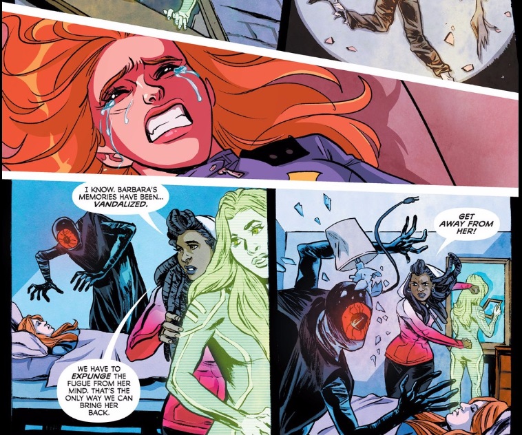 As great of a story The Killing Joke is, I’m not necessarily a fan of forever tying Barbara Gordon to that terrible moment of trauma in her life. Many Batgirl/Oracle writers have mined The Killing Joke the same way that Jason Todd writers have with A Death in the Family — though I’d argue that both Barbara and The Killing Joke are far more interesting and deserve their own histories. Nevertheless, Tarr conjures up a powerful image as we see Barbara lying motionless on her back, tears cascading down her cheeks. With all of the artists working on Batgirl 49, I have to believe that Babs Tarr wanted to do justice to that painful moment herself. Just like Joker’s attack in The Killing Joke, The Fugue’s assault on Barbara’s memories is a violation. Barbara’s greatest gift/weapon is her incomparable photographic memory; so to have that messed with in any way is such a wound for her.