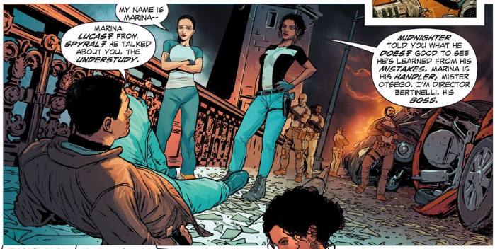 Our story finds Midnighter captured by the Suicide Squad; even though he continues to talk big and quickly escapes, it isn’t long before he’s defeated and captured yet again. Writer Steve Orlando seems to be establishing that Midnighter’s confidence blinds him to his own failings, and causes him to repeat the same mistakes over and over, a fact Helena Bertenelli of Spyral manages to vocalize on the issue’s very first page.