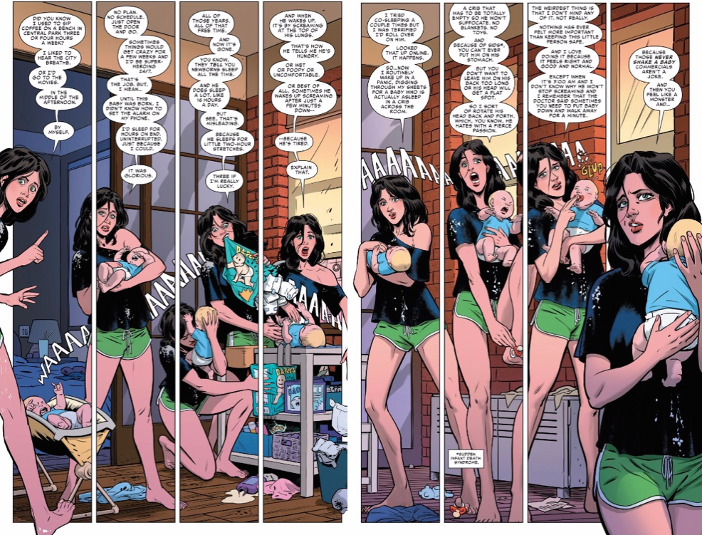 Drew: You know, it hadn’t occurred to me that the baby doesn’t have a name, but I think that speaks to the focus of this story: it’s about Jessica Drew being a parent, not necessarily about her relationship with her son. The baby is treated more like an emotionally charged prop than a character, which may sound a bit dispassionate, but I think it’s accurate to the first few months of parenting. Jessica notes that he can’t hold up his own head, but he also can’t really recognize faces, move his hands with any intention, or really demonstrate any kind of personality. In short, he isn’t a character yet, so I think it’s perfectly logical to focus on Jessica’s story, even if all she’s thinking about is the baby.