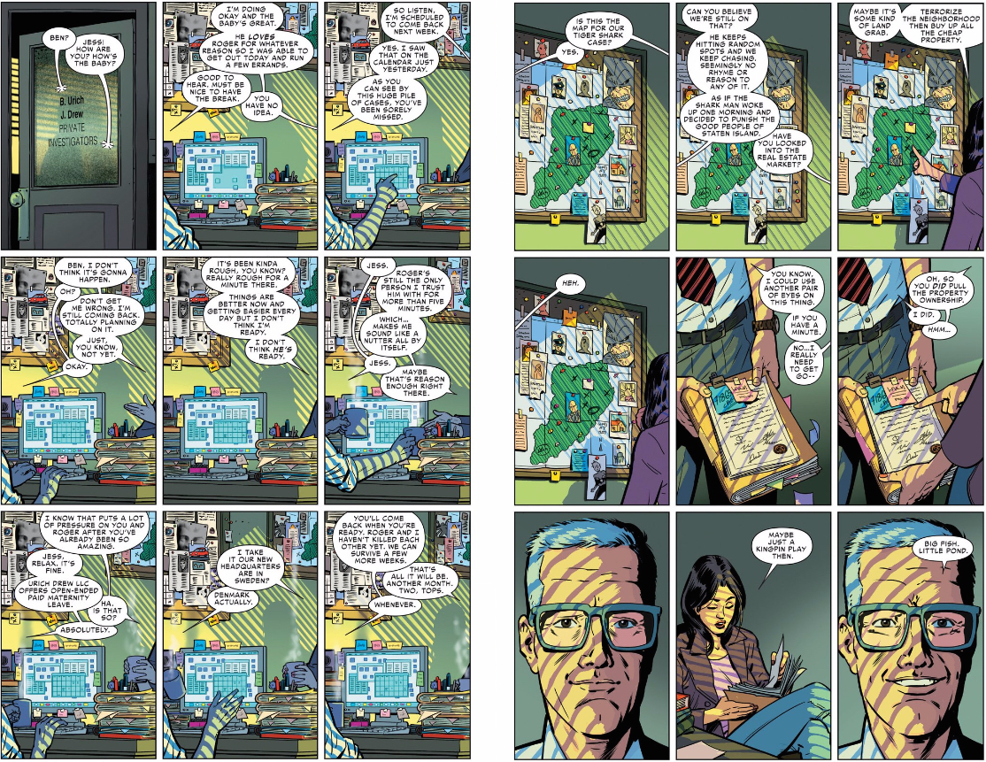 Again, don’t worry about the text — I’m more interested in the framing of each panel. At first, I was a little baffled at Rodriguez’s choice here — he’s so gifted with expression, it seems a waste to plop the camera down in the same place without ever showing us any faces — but once again, the art is reflecting Jessica’s subjectivity. Sure, she’s having a conversation with Ben, but all she’s seeing is the work stacked up on his desk. She’s daunted by the thought of returning, and fixates on the negatives. It’s not until Ben finally manages to intrigue her with a case that she recognizes that human connection again, at which point Rodrigues pulls in for that closeup on Ben. In an issue full of reasons why Jessica might not ever want to return to her day job, this scene manages to give us just enough to believe that she might change her mind.