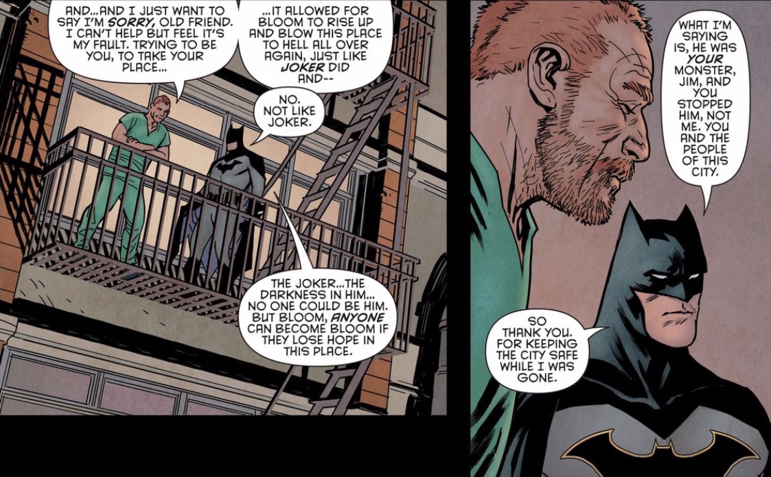 Batman refutes the notion that Mr. Bloom is another Joker; which in turn is Snyder refuting what many Batman readers have been suggesting. While Mr. Bloom might not have the “darkness” of the Joker, he was the archnemesis of Gordon-Batman for all intents and purposes. The fact that we never really find out who Mr. Bloom is under that mask adds to his Joker-ness, as well. Snyder does so love for his heroes and villains of Gotham to mirror each other, so it’s no surprise that Batman says that anyone could be Mr. Bloom. The combination of “anyone can be Batman” and “anyone can be Mr. Bloom” are seemingly incongruous but the intended message is clear: we all have the potential to be a hero or a villain.