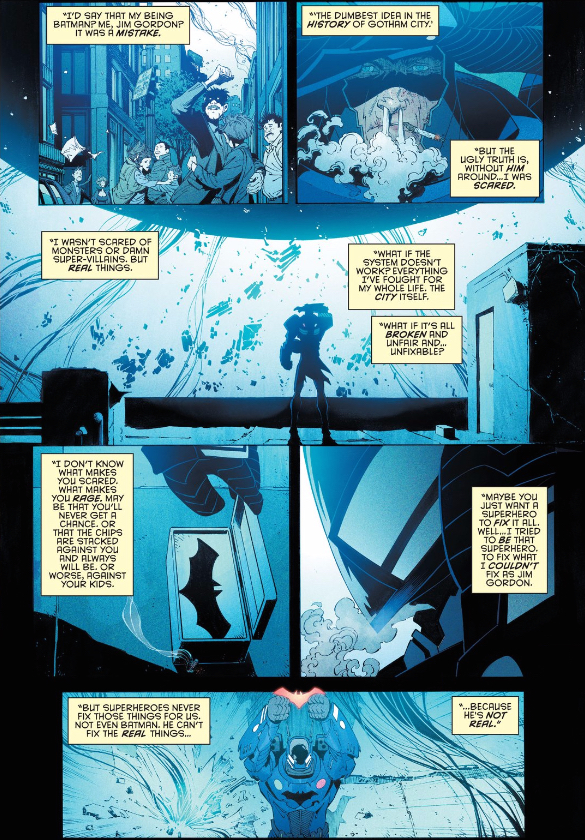And I think that’s Snyder’s point here. For all the bigness of this storyline, the core truth is as simple as our understanding of what fiction is: Batman is “not real.” You can’t be him, I can’t be him, even other fictional characters can’t be him. Moreover, the problems that he fights are not real. Sure, he doesn’t take up the task of fighting real problems, but that’s because he isn’t real. Let him fight the “monsters or damn super-villains”; we have to tackle reality. His job isn’t to solve our problems, but to inspire us to solve our own.