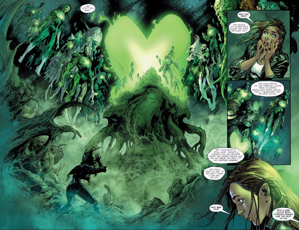 Grail’s Wonder Woman-stylized origin didn’t really land with me, making Jessica Cruz the more enjoyable part of the book. A lot of that probably has to do with Ivan Reis and Joe Prado, whose already impressive artwork reaches another level when highlighted by Alex Sinclair’s Green Lantern colors. They deliver the horror of Volthoom’s prison, the willpower of Jessica Cruz and the comical fear of Power Ring. I hope that Reis and Prado enjoy drawing a cowardly “Hal Jordan” as much as I enjoy seeing one from the former Green Lantern team. The Jessica scenes aren’t particularly deep however — amounting to Power Ring saying: “Be scared! It’s safer” and Jessica saying: “That’s not who I am anymore!.” Nevertheless the sci-fi inner workings of Volthoom’s power ring hearken to the kinds of DC lore that Johns excels at.