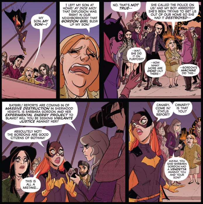 Two things I hate about this moment: first, it’s a callback to the pretty silly then, even more silly now moment from Batgirl 46 (at least I assume this is the same woman), but whatever. The thing that really bugs me is that every single person on that bridge is in mortal danger, not to mention that Fugue just blew up an entire building moments ago, but Barbara takes the time to not only listen to a reporter’s question but also respond to it with a defense of her and her father. Heroic!