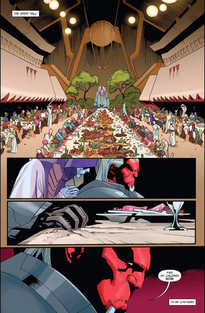 It is paramount that Morax be compelling, because even though it is Emporia who drives the story, it is the King around whom the world is built. Consider something as small as the fact that he is extremely physically powerful — strong enough to crack that table with his fingers. This intimates that he is, ostensibly, one of perhaps several superpowered individuals, or at least different species who have superhuman abilities. This is an important note for establishing this universe. Keeping in mind also that, historically, dictators come into power due to a volatile mix of their own personal power base and a deep fear in the heart of the masses towards something unknown and alien, one can ask: what is everyone afraid of? If you answer “King Morax”, then I would contend that the incredibly advanced technology shared throughout his kingdom provides the populous the means to violently overthrow this maniacal red tyrant should their voices be united. Perhaps next issue Millar will tip his hand about what is going bump in the night that is keeping everyone under the thumb of this autocrat.