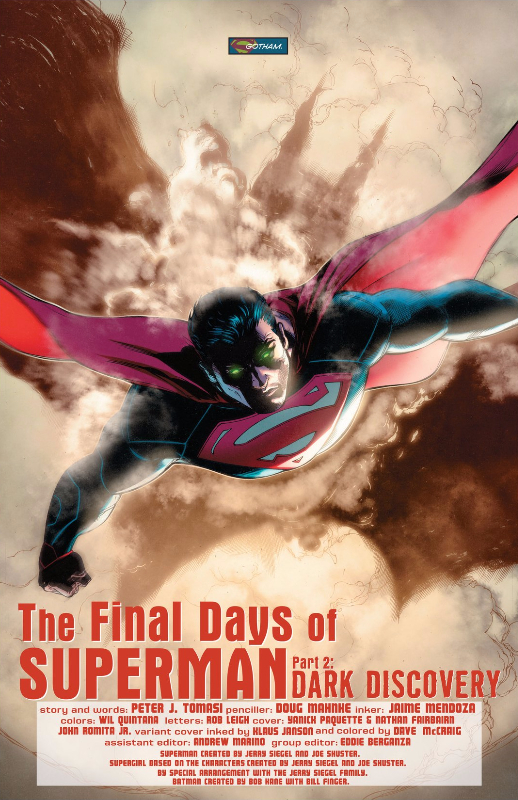 (The creative team does something similar on a grander scale; there’s a two-page sequence set in Metropolis, and the city is a startling contrast to Batman’s Gotham. Metropolis is bright and vibrant, yet while context seems to suggest that the scene takes place concurrently with the rest of the issue, it’s so dark and gloomy in Gotham that it appears to be nighttime there. Again, it’s a nice visual representation of the differences between these two friends by Quintana and the rest of the artistic team.)
