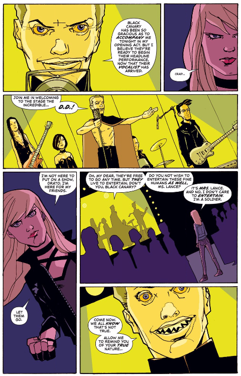 Here Dinah finds herself in a hall of mirrors which may possibly be an illusion created by Orato, which Loughridge depicts in full turquoise, making the red of Dinah’s blood when Orato attacks her stand out all the stronger. When Dinah is presented with a vision of her dead mother, though, that turquoise falls away, replaced with a flashback-appropriate gray. This really is the culmination of Loughridge’s work in this issue; he uses color to differentiate between scenes, characters, time-periods, and to create unique, memorable images. More than any single artist, Black Canary‘s signature look relies upon Loughridge, and that’s an achievement worth praising.