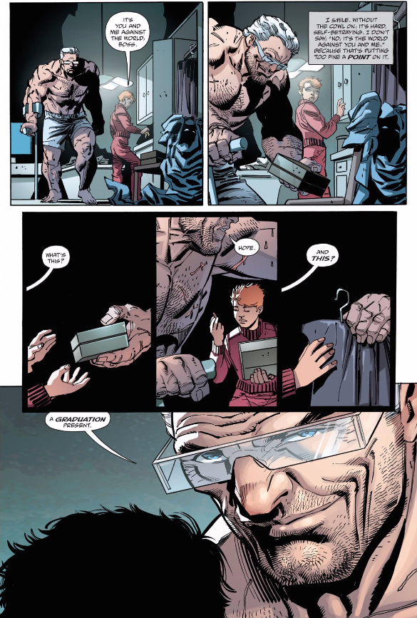 It’s that “30 years ago” line that gets me. You know what else is 30 years old? The Dark Knight Returns, that’s what. The obvious reading is that Frank Miller and Brian Azzarello are using this franchise, this machinery built 30 years ago, to remind us that humanity sucks. Of course, that presumes Yindel is the most appropriate Miller/Azzarello analogue, which I believe it’s safe to assume isn’t the case. By the end of the issue, Batman has arrived to talk some sense into Yindel. I think the better reading is that Yindel is offering an incorrect interpretation of The Dark Knight Returns, one that a once-again-in-the-costume Batman is here to fix.