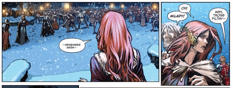 He’s even kind of the victim of a lot of the same hero-blaming that characters like Batman and Superman have been pegged with in recent years (thanks, Watchmen). The back half of this issue turns into an all-out chase sequence as Klaus attempts to escape a trap laid by the city guard. He’s a champion of the people, but despised by the authorities. The rip-roaring battle through the streets and rooftops of Grimsvig is not only true to its superheroic inspirations, but also amazingly fun. Klaus bounds up stairs, zooms out of windows, slices his way down 100-foot tapestries — it’s obviously over the top, but to quote that guard from earlier: “it’s exciting all the same.”