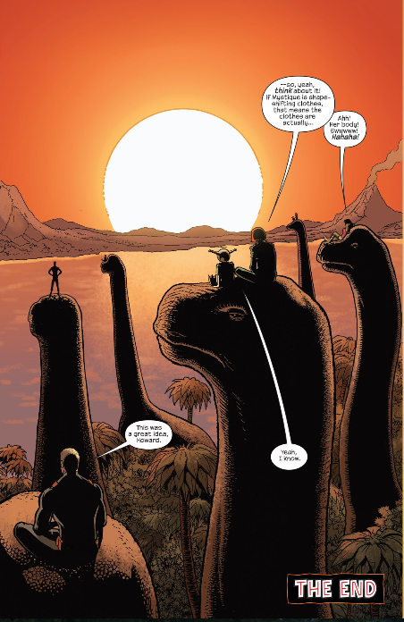 The panel above is the last of the issue, and the final moment after several Jurassic Park references and a few impressive dino fights. With one more inane in0universe commentary against a beautiful backdrop, it’s a satisfying ending to a diversion of an issue.