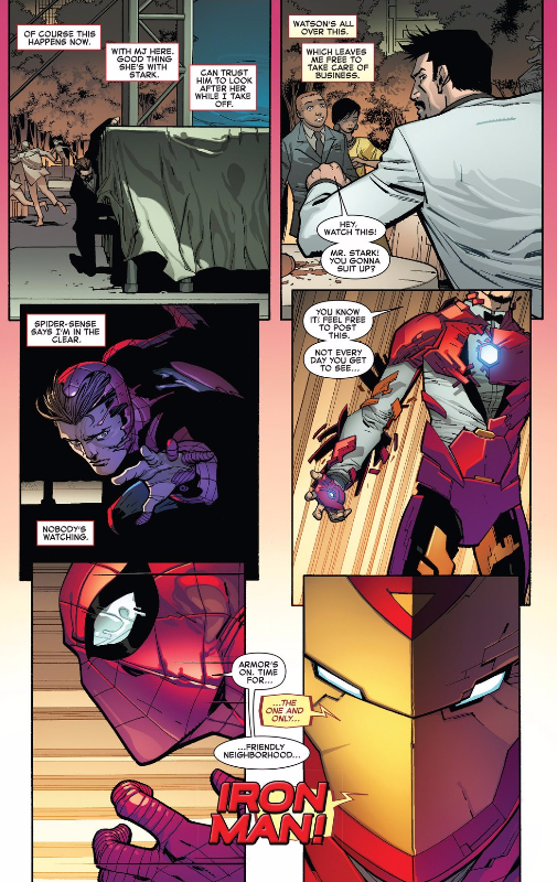 For all his newfound success, Peter still has to hide his power, while Tony gets to bask in his fame. Yeah, Peter’s jealously is certainly understandable, but that doesn’t justify it; Peter’s childish behavior reflects badly on him throughout the issue, and he remains petty even after he and Tony come together to defeat the Ghost. I’m thinking specifically of his ill-fated attempt to hire Pepper Potts just to make Tony jealous; it’s a low point, and furthermore, one that makes me question Peter’s view of women ever-so-slightly (look how he expects Tony to stay behind and “protect” Mary Jane in the image above while Tony trusts her to take care of herself and others).