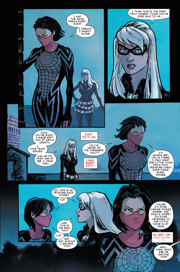 Backed into a corner, Cindy spends this issue first trying to convince Mockingbird that she’s not the same Silk who has robbed every major tech company in New York, then trying to convince Black Cat that she is. We know the truth all along, which makes it particularly heartbreaking that Cindy is only believed when she’s not telling the truth, though it helps that she’s able to goose that lie with a genuinely honest moment: