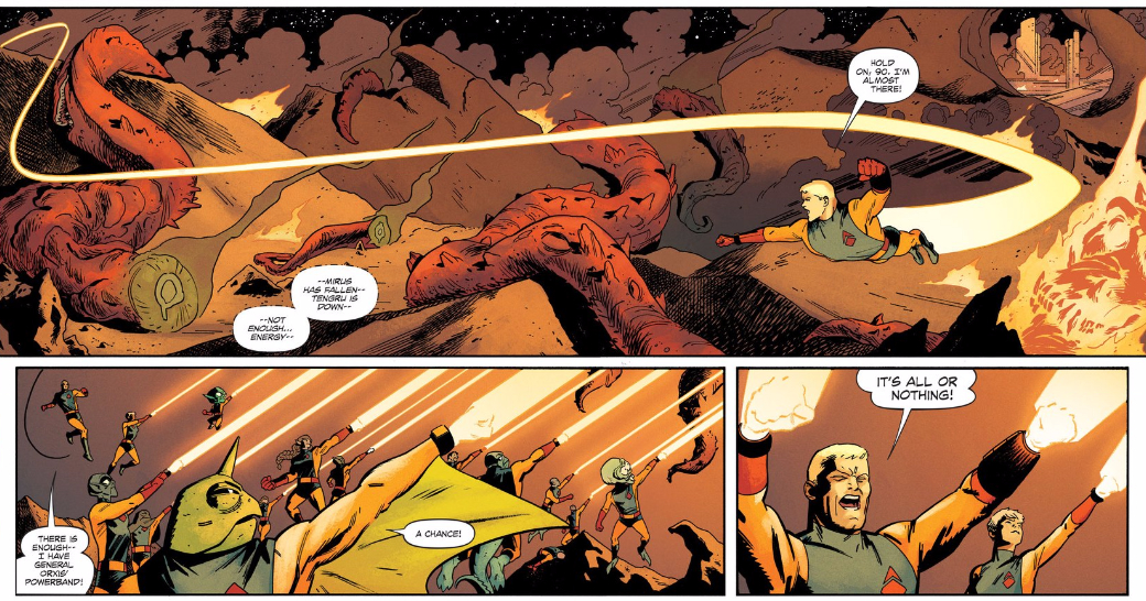 These little kind of enemies look to be precisely the right kind of fodder to provide a minimal threat, the kind that put our heroes through their paces without distracting from the heroes themselves — that’s exactly what we need to get to know our many protagonists and their abilities better. That can be valuable, but I also want y’all to take a closer look at these little critters — they look quite similar to Omnikron, the beast the Space Force seemingly destroys in the issue’s cold open, no? Hey guys, I think we’ve got our “big bad” already locked down tight.