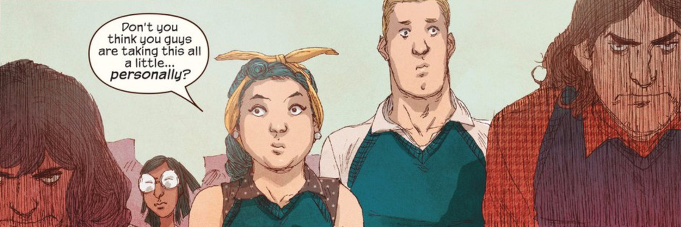 Lest I sell Wilson short, just as much of the charm of this series comes from the writing. I may never live down my early dismissal of this series as over-reliant on teenage archetypes and familiar situations, but this issue truly demonstrates how all of those elements have been complicated with the benefit of time. The tension here doesn’t come from tropey evilness or even people out to hurt one another, but from believable characters behaving in totally logical ways. Indeed, the only “villain” in this issue is the situation, with Ganke insisting that “we shouldn’t have to battle to the death just to get into good colleges and not end up a trillion dollars in debt afterwards.” That’s not the kind of message I expect of superhero stories, but it’s exactly the kind of thing Ms. Marvel is so good at tackling.