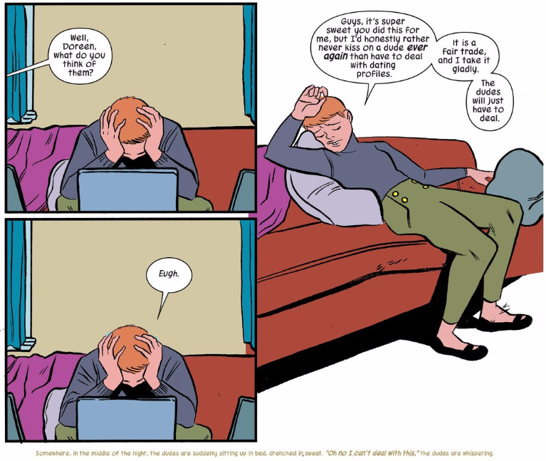 Introducing romance to The Unbeatable Squirrel Girl, then, adds some interesting new conflicts to the title. It seems significant, though, that even when faced with near-infinite romantic despair, Doreen never loses her confidence and the sense of self that has come to define this series — she knows she’s a catch and worthy of love even if she feels utterly powerless to find it.