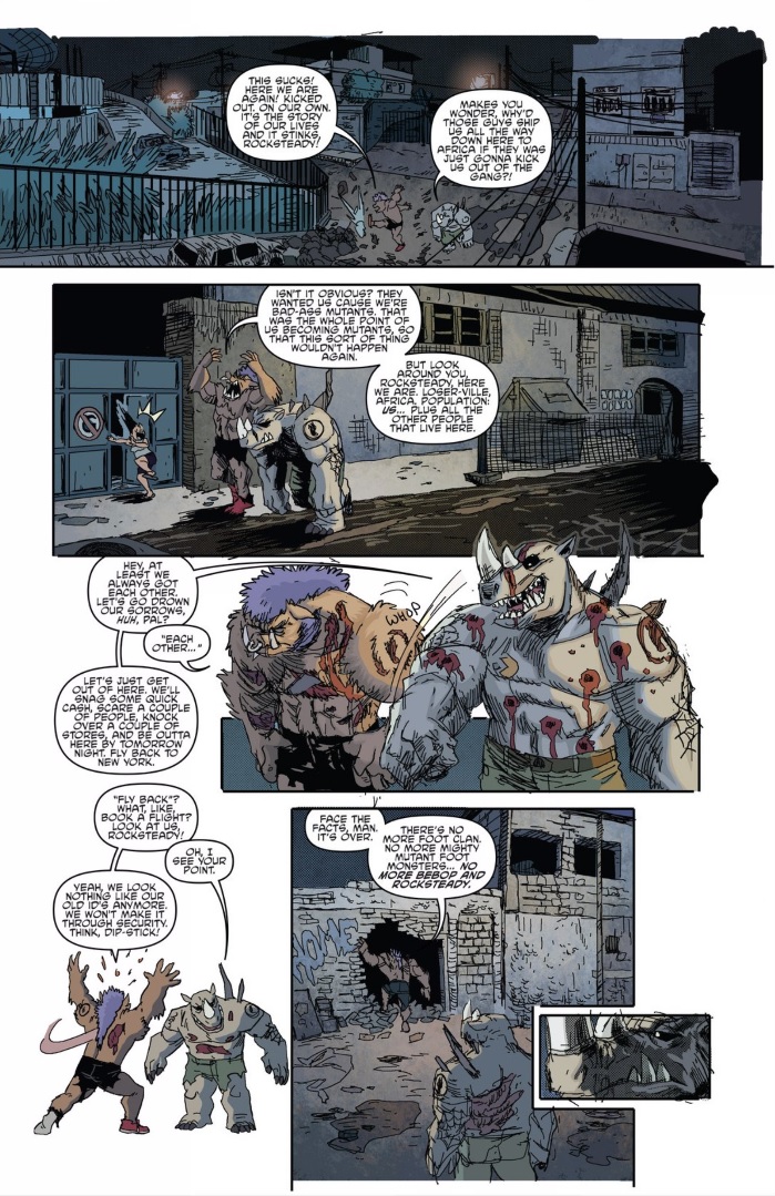 The characters of Rocksteady and Bebop have existed for nearly thirty years now, and I found it interesting on this page to see these two come to terms with their drastic physical changes, reminding the audience that, even if we have their action figures in a bureau under our beds from a long time ago, these two people are irrevocably changed into the stuff of nightmares. Also, kudos goes to Bates for including some pretty brutal looking wounds, blood, and murder to a title backed by Nickelodeon. These injuries are important in the transition to hero status mentioned before: I am unsure as to whether this series would work if the two kept the “unstoppable, impervious tank” status they often have while playing the bruisers in the most depictions.