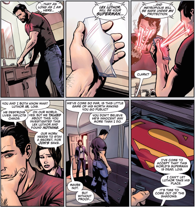 Still, Superman openly admits that, as far as he can tell, this Lex Luthor hasn’t done anything wrong. He doesn’t trust him based on his experiences with the Lex Luthor of his own Earth, but can’t prove or even identify anything this Luthor has done wrong. There are still a million ways this story could go — and the introduction of another Clark Kent could essentially upend whatever we think is going on right now — but thus far, Superman’s actions seem to fly in the face of Truth, Justice, and the American Way. Moreover, they betray a total lack of trust and goodwill on Superman’s part. I can appreciate that his experiences with the other Lex Luthor have taught him not to extend that goodwill, but that feels decidedly lacking in in the hope that is meant to define this character. Instead, he comes of bitter and suspicious.